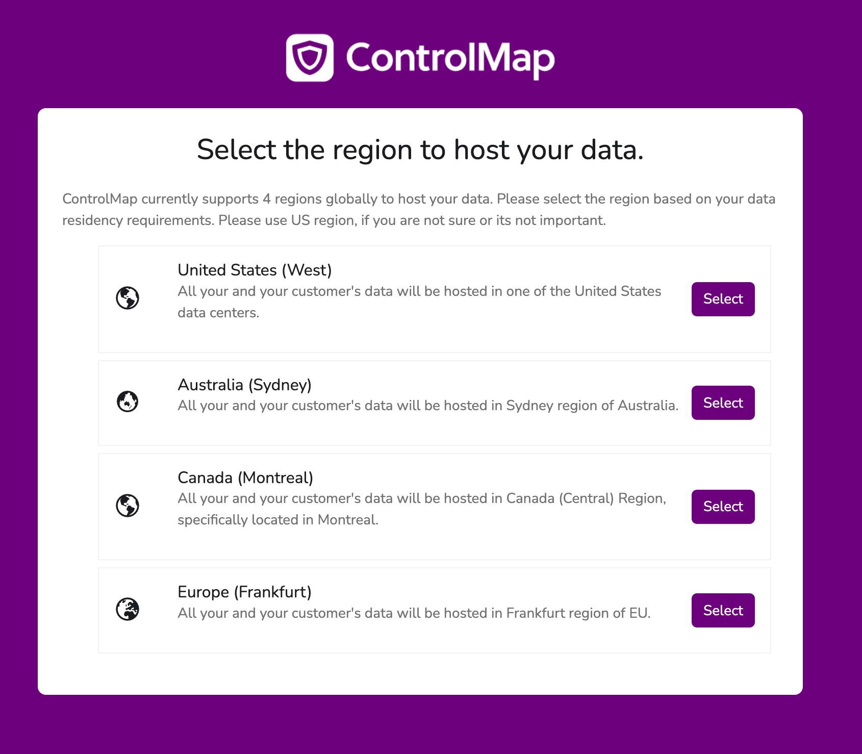 ControlMap's application is hosted on Amazon Web Services (AWS) cloud service within the following regions. The different regions are supported based on client location and compliance requirements.